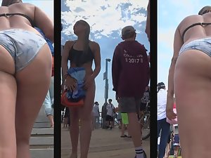 She just got out of the water and that made her ass and bikini soaked wet and even hotter than when it is dry. Voyeur follows her along the beach and zooms in on her seductive ass wiggle. Seems like wetness of her bikini is only making her butt crack swallow even more of it.