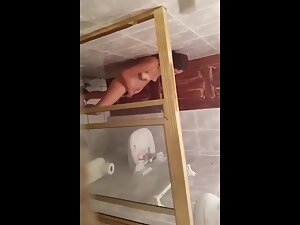 Window peep on naked girl fingering pussy in bathroom