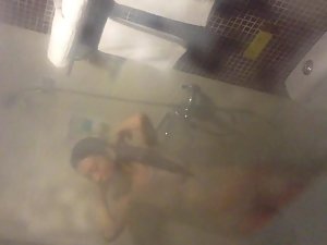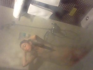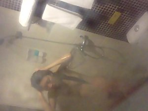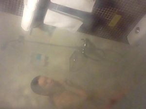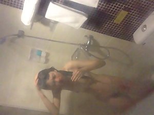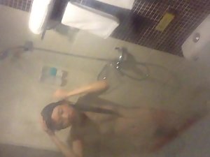 Petite chinese girl is all soapy and wet and there is no way for her to look up in the shower, so she didn't notice that a voyeur is holding his camera by the window and recording her naked body. She is very skinny and flat chested, but with a lovely little hairy pussy. Feels lovely to peep on her while she showers so thoroughly.